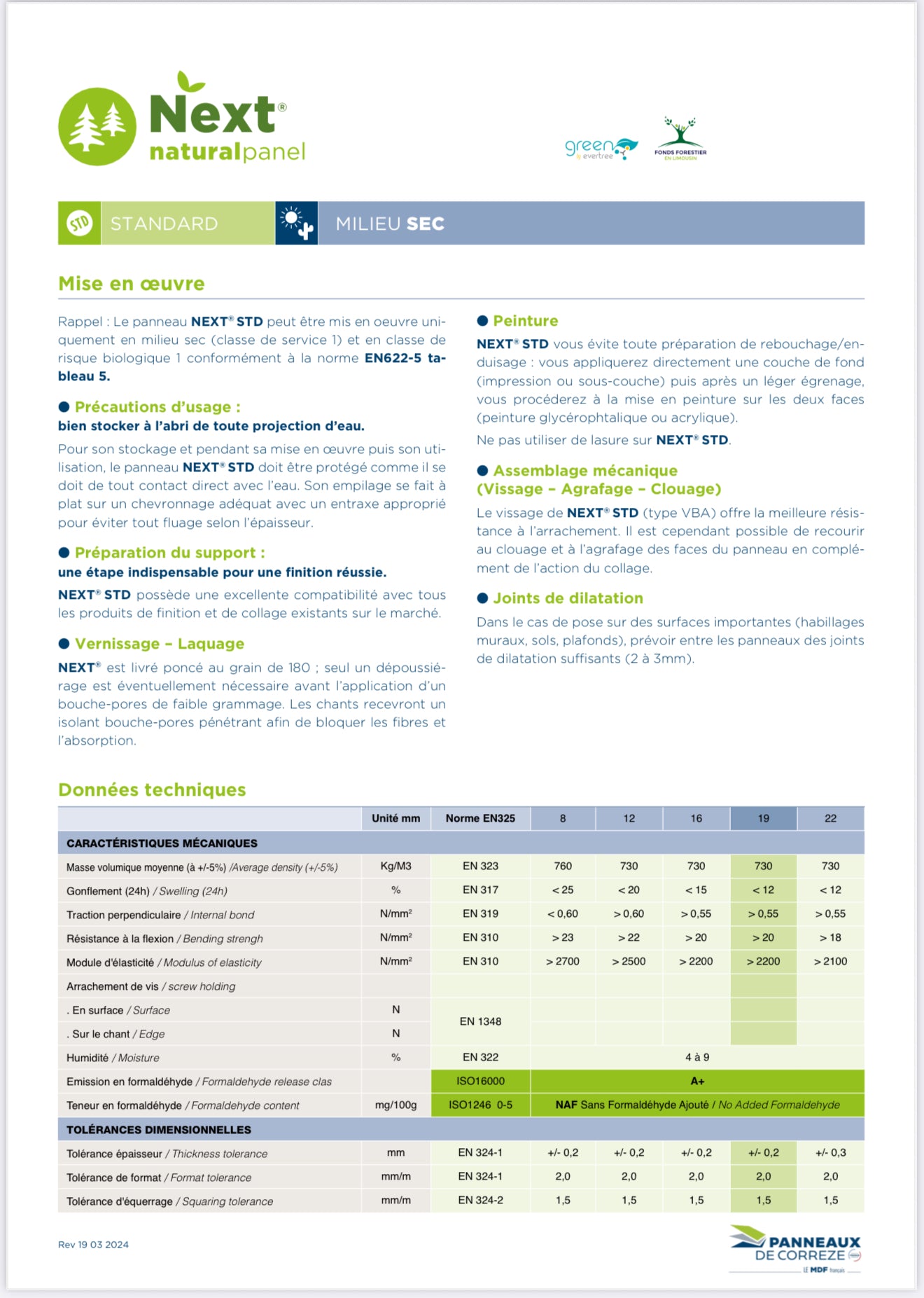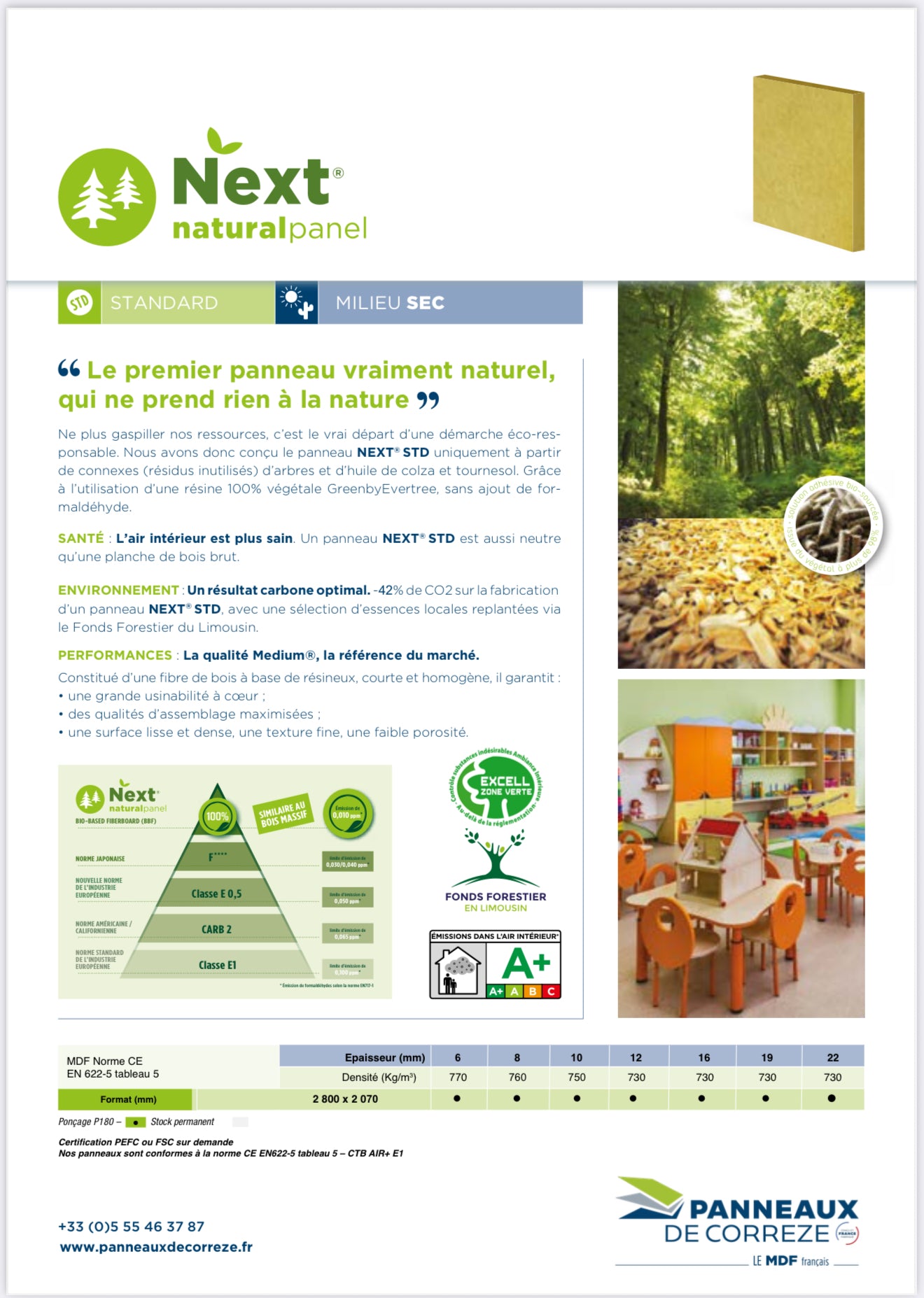 Elle est désormais fabriquée en MDF NEXT®, un panneau innovant issu de bois résineux locaux (Massif Central) et d’une résine 100 % végétale (colza / tournesol), sans ajout de formaldéhyde.